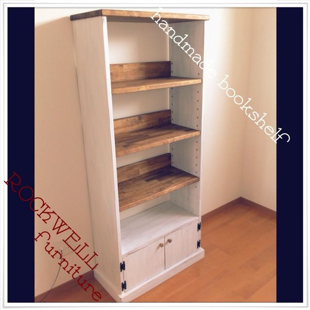 メルクシパイン集成材にワトコオイルフィニッシュ(ウォールナット色)と水性ステイン下地をしてその上からEPシャビーホワイト塗装仕上げ。