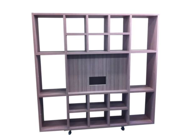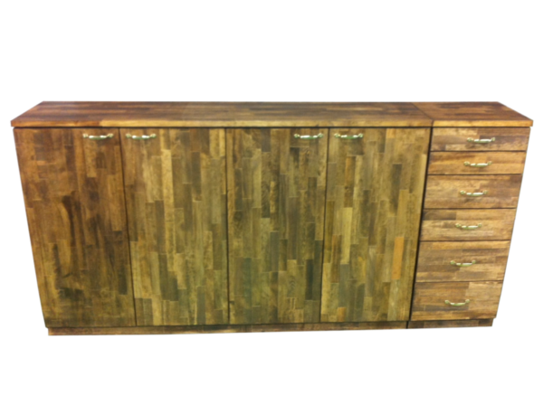 メルクシパイン集成材ワトコオイルウォールナット色仕上げ。棚は全て可動式。引き出しにはソフトクローズ式のレールを使用。